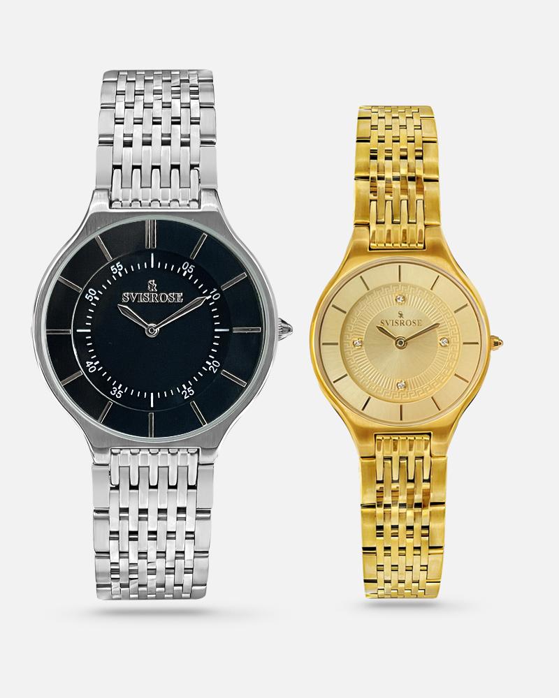 اطلب الآن طقم ساعات نسائي ذهبي ورجالي فضي من سفيسروز، واجعل إهداءك يحمل معنى الفخامة والأناقة التي تدوم.