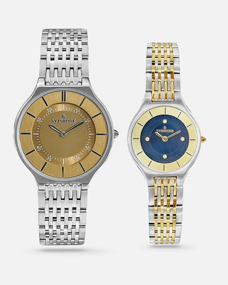 طقم ساعات سويسري أصلي يجمع بين ساعة نسائية فضية مع تفاصيل ذهبية أنيقة وساعة رجالية فضية بتصميم فاخر. الطقم يجمع بين العملية والفخامة، مناسب للاستخدام اليومي والمناسبات الخاصة، كما يأتي في علبة أنيقة تجعله مثالياً للهدايا الراقية.